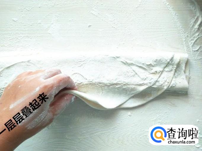 面皮压好之后,上面一定要多放一些面粉,这样一层层叠起来,每叠一层反顾一层面粉,不然会黏到一起的。