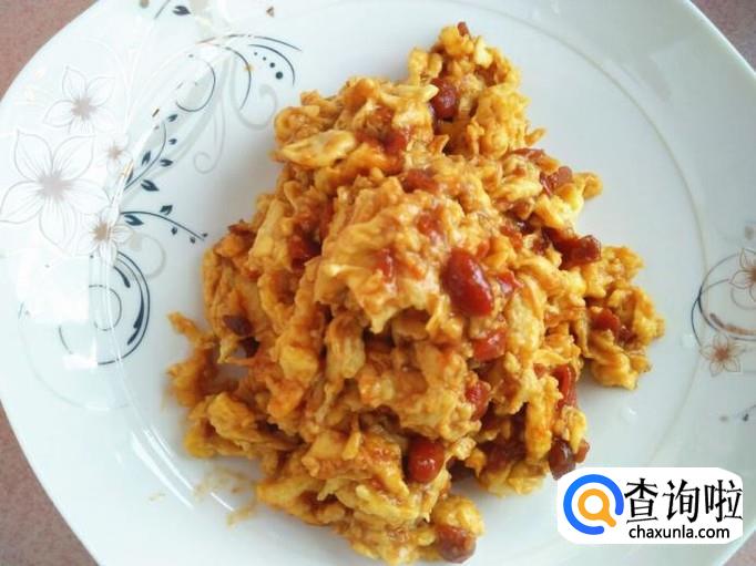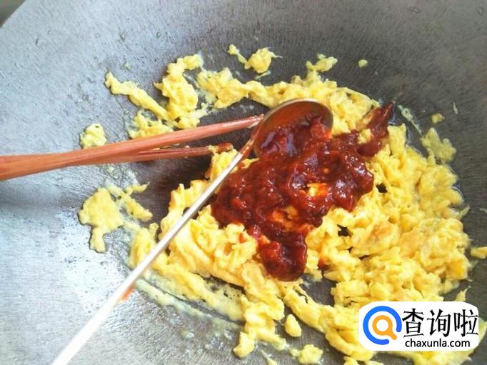 鸡蛋炒的嫩嫩的时候,把黄豆酱放进去,量的多少自己掌握,俩鸡蛋的话俩勺黄豆酱就可以了。