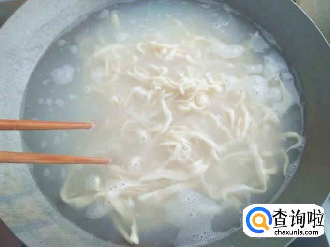锅里放上清水,烧开之后把面条放进去煮。因为是手擀面,所以放进去的时候也能够筷子轻轻的划开,免得黏连在一起,还要注意,煮面的时候锅里放点盐,面条不容易烂。煮好面条之后,快速盛放在凉水中,然后捞出来放进碗里。