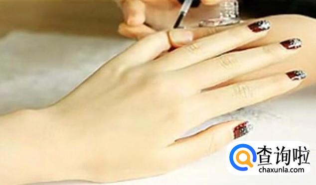 接着涂第二遍彩色指甲油,甲油未干就上闪粉或亮片,可以自己制作组合各种颜色,自己喜欢就好。