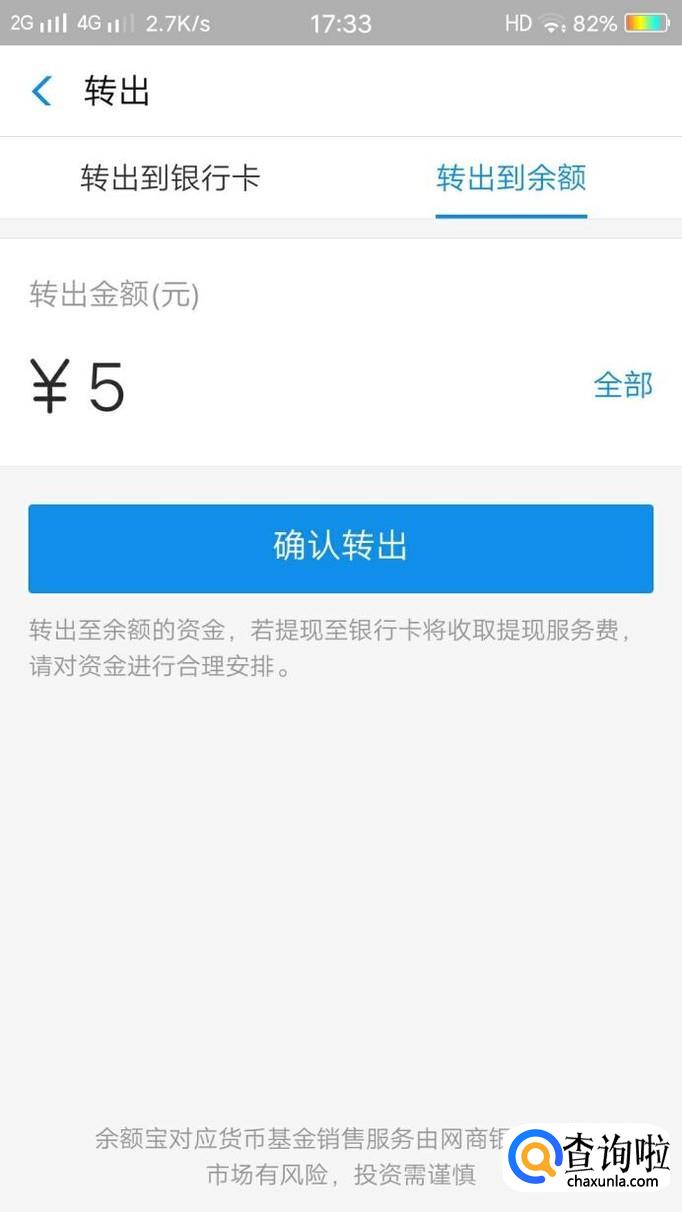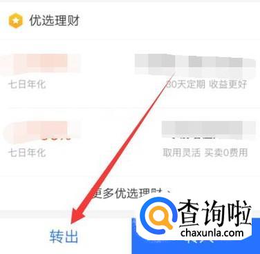 进入之后,点击“转出”,将里面的全部金额转出到余额里面,如图所示。