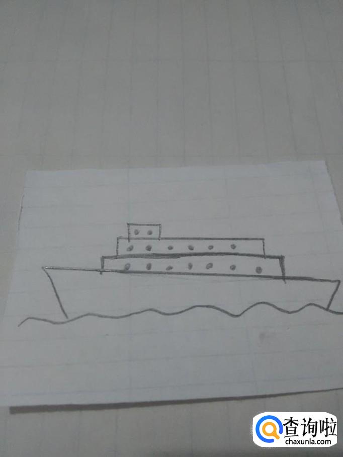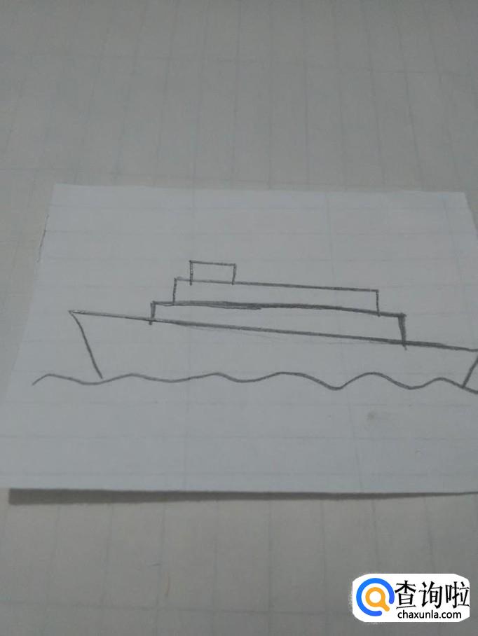 在长方形上方再画一个长方形,表示烟囱,在烟囱上方画三条曲线,表示冒出来的烟,轮船就画完了。