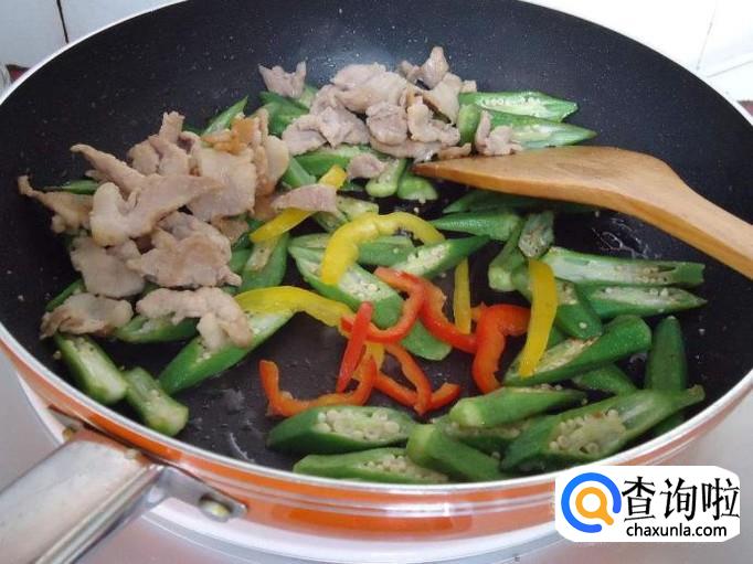 锅中加油,然后待油热时加入猪肉片,爆炒1分钟,加入辣椒翻炒。接下来将刚刚炒好的葫芦瓜片倒入其中,翻炒至熟