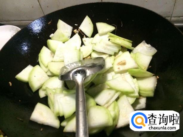 锅中加油适量,油7-8分热时向其中加入葫芦瓜,翻炒至其边缘成透明色,舀起