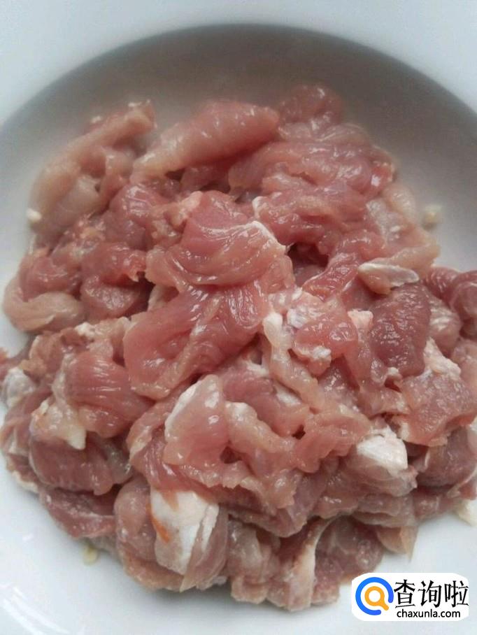新鲜的猪肉洗净,切成薄片,加盐,味精,花椒,姜片,苕粉,酱油,搅拌均匀,腌制15分钟