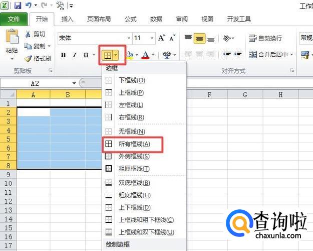 之后我们点击工具栏中边框按钮的下拉箭头,弹出的界面,我们点击所有边框;