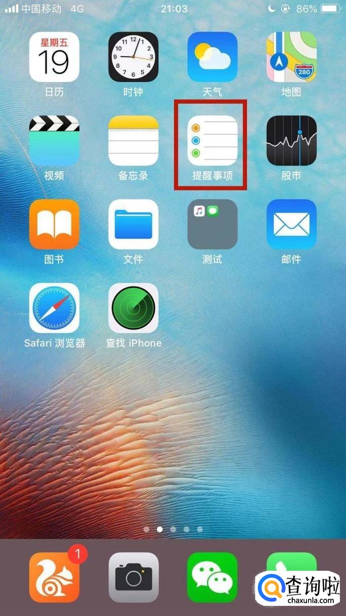 首先在我们的手机桌面上找到提醒事项并点击它,如下图所示。