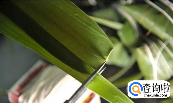 接下来我们需要把粽叶用清水清洗干净后,用剪刀剪掉粽子的根部,放入锅里面煮几分钟。