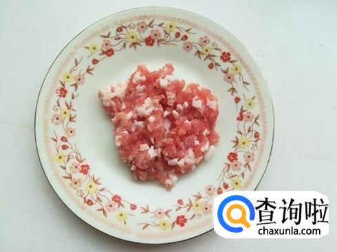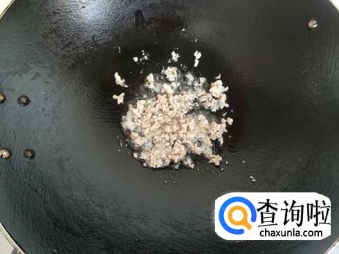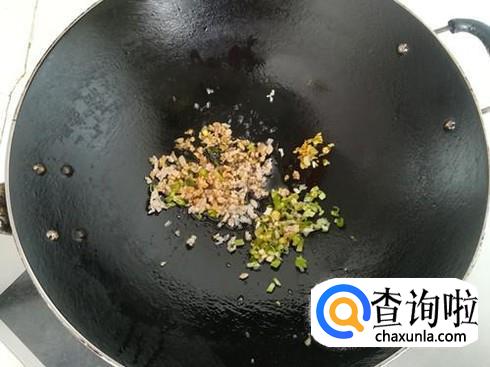 炒锅放火上,加入适量花生油,,等油温有五成热时,把切好的猪肉粒入锅炒至变色,再加入葱,姜末,盐和味极鲜酱油调味。