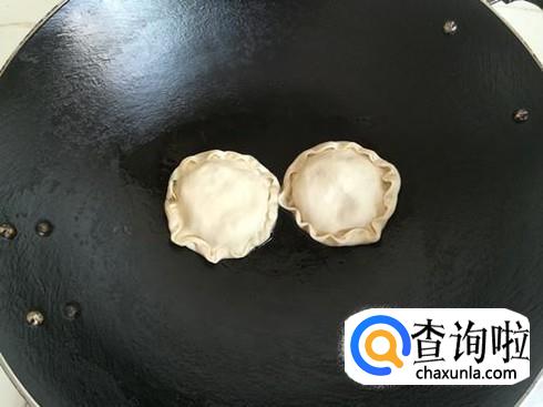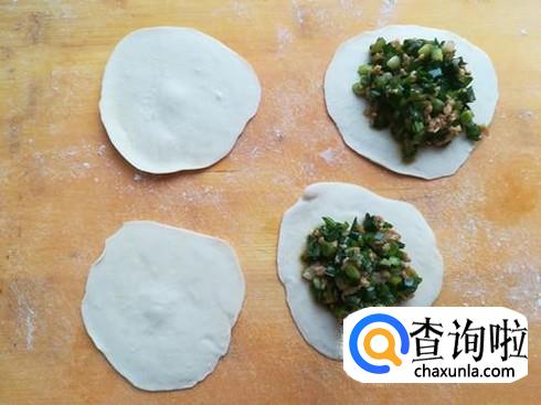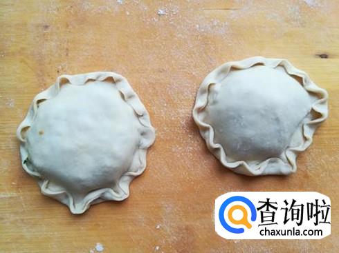 把小剂子擀成中间厚周边薄的圆形面皮,再用勺子舀一勺韭菜馅放在其中的两个面皮上,然后把另外两个面皮,盖在有馅的面皮上,把周边压死,捏成花边,如图,这样花边馅饼生坯就做好了。