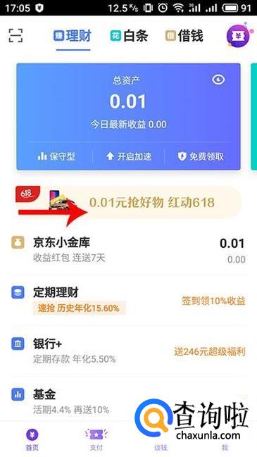 进入京东金融APP界面,在理财中点击推送的“0.01元抢好物 红动618”进入。