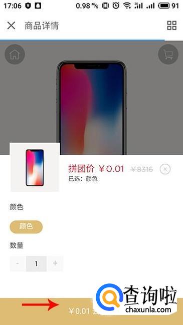 弹框提示商品规格,确认之后点击“0.01去开团”