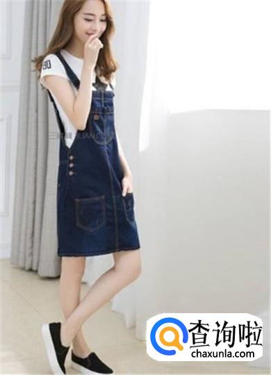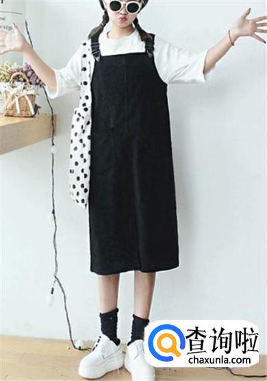 直筒形的深色背带裙配一双白底黑色休闲鞋,看上去特别休闲、自在、随意,让人感觉很轻松,这种穿法比较适合身材好、又随性的女孩。