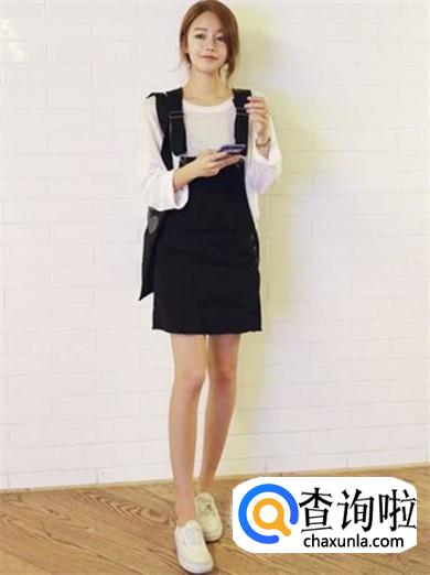 深色背带短裙配一又白色板鞋,简洁大方,深颜色又修身的背带裙显得女性较瘦,所以,这种穿法特别适合体型稍胖的女孩。
