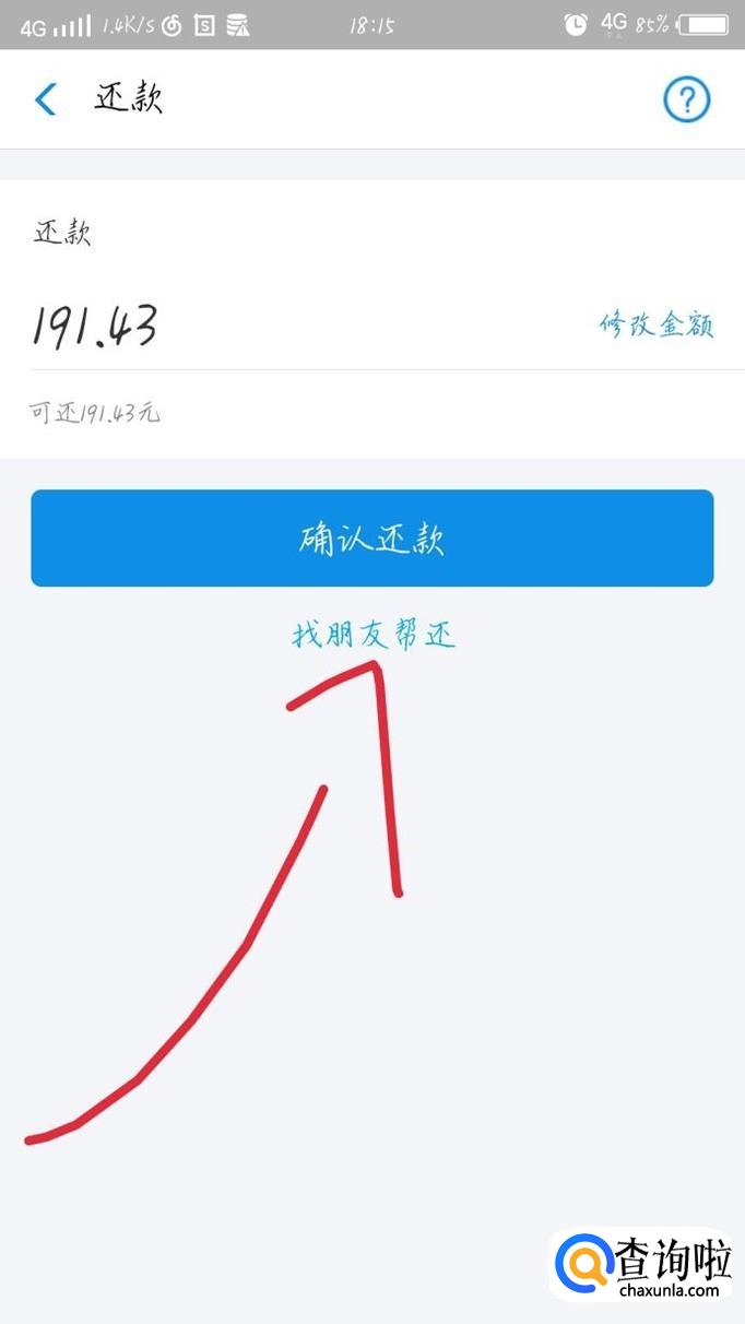 点击“下月应还”选项,如图1箭头所示。会出现一个新的界面,点击“提前还款”选项,如图2箭头所示。会出现一个新的界面,点击“找朋友帮还”选项,如图3箭头所示。生成邀请就可以了。