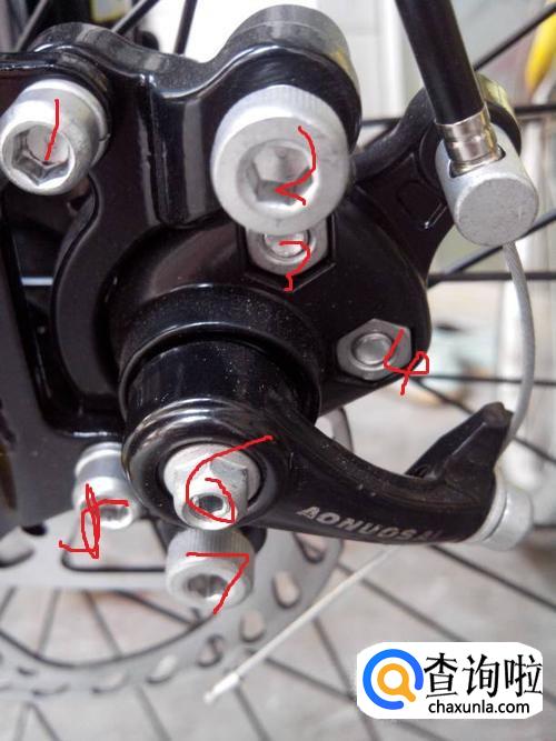 刹车器上总共有七个螺丝。根据螺丝位置的不同,有负责相应位置的用处,比如螺丝1与螺丝2是用来固定碟刹器的,而螺丝5是用来固定刹车线的。螺丝3与螺丝4用来确定碟刹片到两边的距离。只要缝隙合适,就可以调节的3和4螺丝来解决问题。