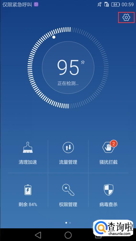 打开手机管家后,右上角有一个设置的图像,如图中红框内所示,将其打开。