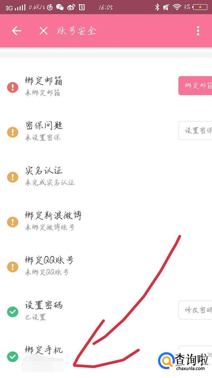 向下滑动手机,点击“绑定手机”选项,如图1箭头所示。如果你要更换手机号码,也是在这里。