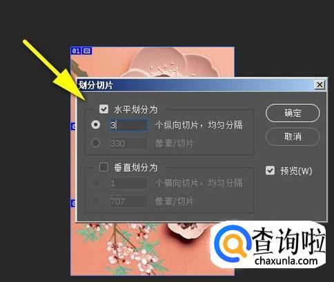 比如,我们要把图片横向平均分割成三分。那么,在“水平划分为”这里打上对勾。再输入数字“3”。再点确定。