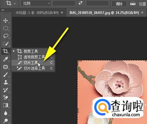 鼠标移到左侧的工具栏中,长点住裁剪工具,在弹出的列表中选择:切片工具