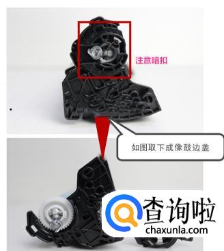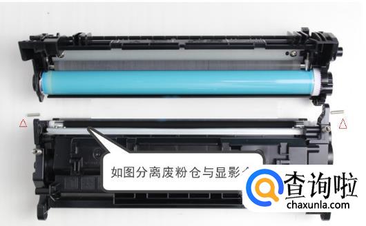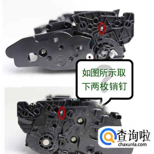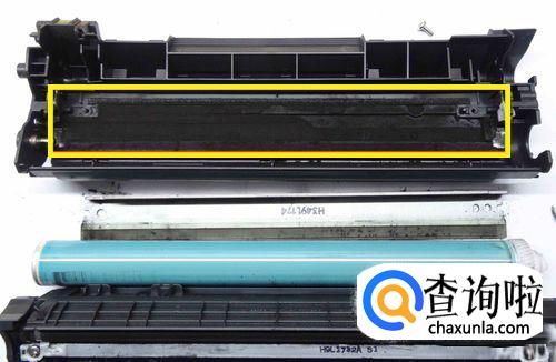 拿出打印机的硒鼓,找到硒鼓上有两个塑料塞,一大一小。大的在硒鼓一端,是灌粉口;小的在硒鼓的侧面,是废粉口。