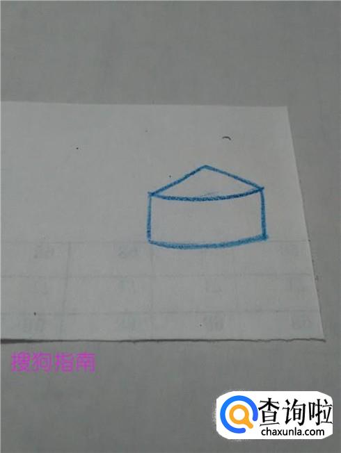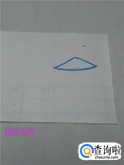 先用蓝色彩笔在纸上画一个三角形,三角形的底边要弯一点,表示蒙古包的顶部。