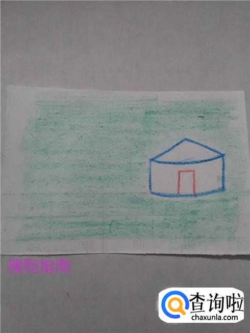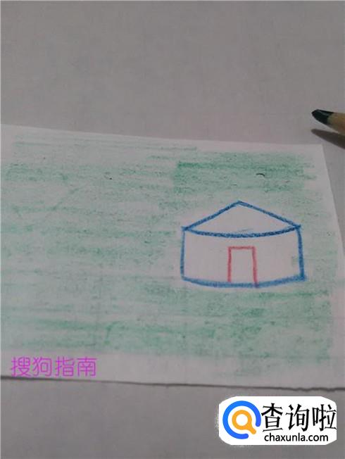 用绿笔将蒙古包以外的地方涂成绿色,表示大草原,草原上的蒙古包就画完了。
