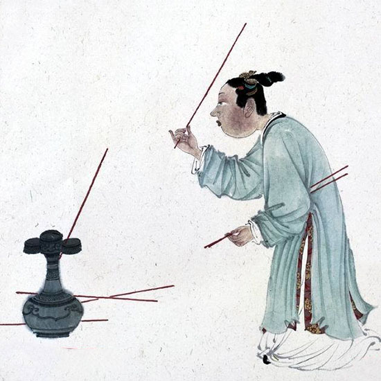 投壶是古代士大夫饮酒时博弈助兴的一种游艺项目,是射礼的演变和延续。在战国时期较为盛行,尤其是在唐朝,得到了发扬光大。投壶是把箭向壶里投,投中多的为胜,负者照规定的杯数喝酒。