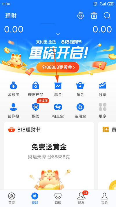 2.在理财页面显示的诸多理财服务(比如定期理财、黄金投资、余额宝、股票、基金等)中,找到基金板块,点击进入。