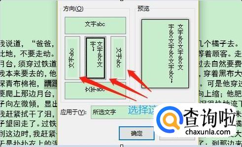 接着依旧在刚才的“文字方向”下拉菜单里,不过这次我们点击“文字方向选项”,然后在文字方向对话框,选中竖排的三种形式之一,点击确定以后效果如图所示,我们看到只有刚才被选中的文字方向改变了;