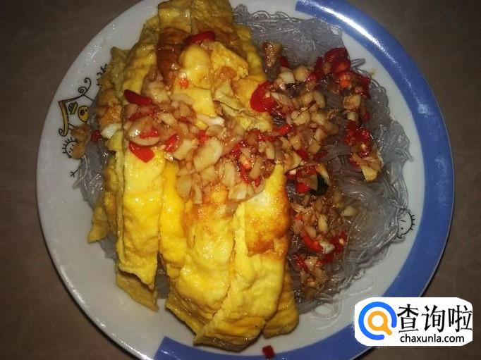 把鸡蛋丝铺到粉丝面上,然后把调料浇到面上搅拌均匀就可以食用了。