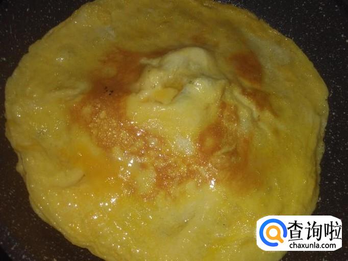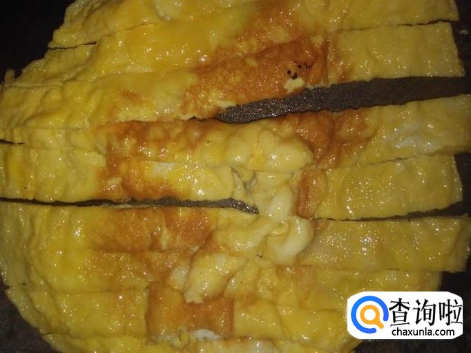 煎得2分钟左右把蛋饼翻转再煎2分钟左右,熄火。铲上板台切成蛋丝。