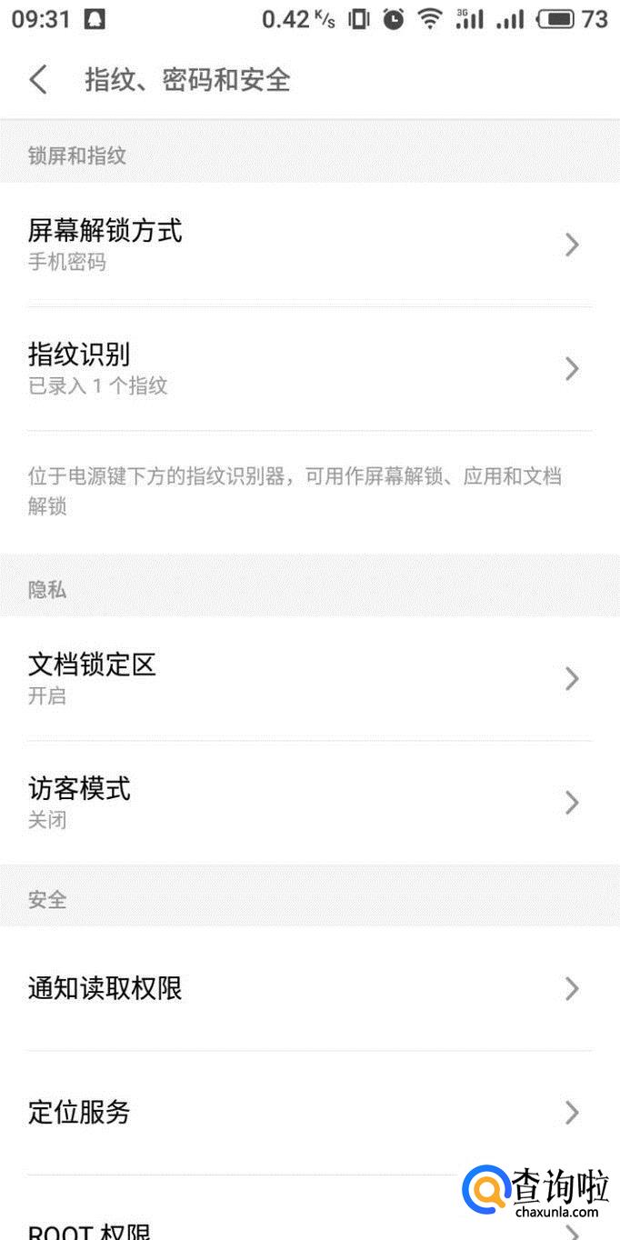 进入指纹、密码和安全设置界面,我们能够看到屏幕解锁方式和指纹识别两个设置,前者就是设置手机密码,后者就是录入指纹。