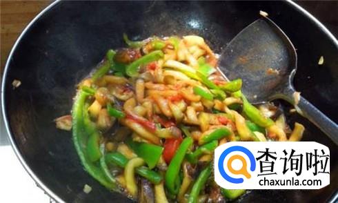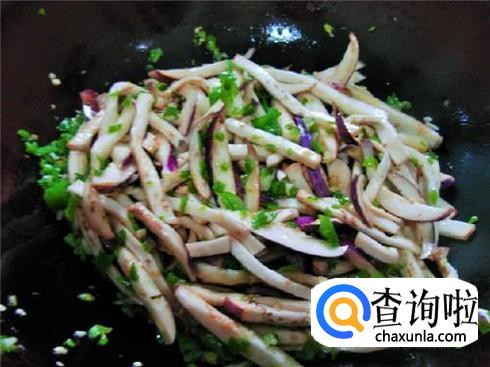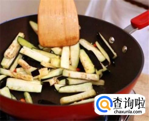 这时候要用小火慢慢的炒,不然很容易糊锅的,等到茄子条炒的变软的时候,加上食盐、生抽快速翻炒。