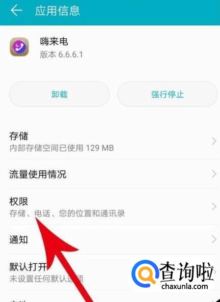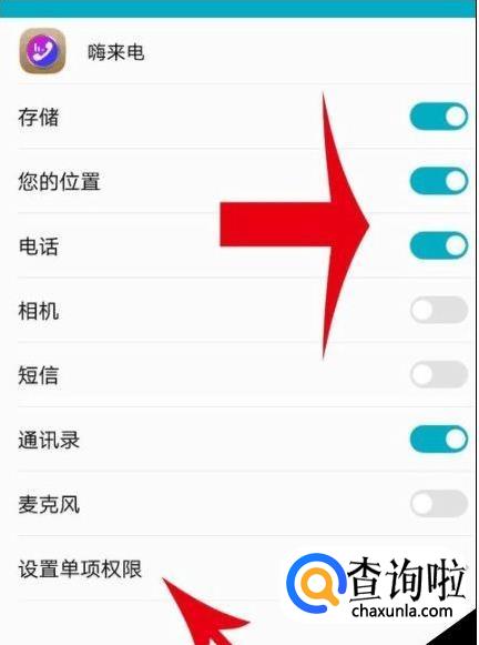 点击嗨来电权限设置,然后点击界面中的蓝色按钮将它关闭,最后在点击“设置单项权限”。
