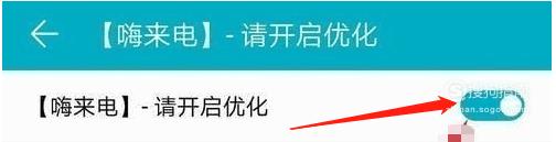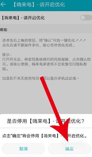 接着点击“嗨来电-请开启优化”右侧会有个蓝色的按钮,打开下面会弹窗后点击“确定”就可以啦!
