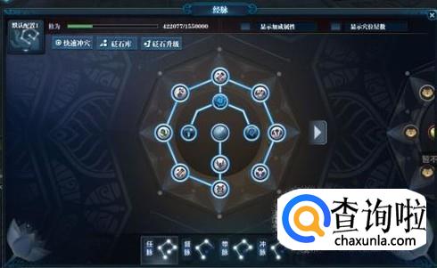 在经脉方面,首选三角砭石和圆形砭石,这两种石头都能够提高命中,一般都是使用紫色品质,土豪玩家使用金色石头来堆。