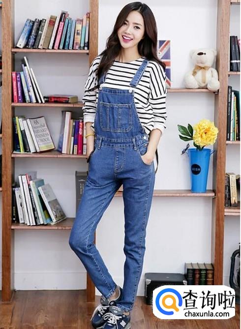 背带裤配条纹上衣。条纹上衣非常时尚,配上背带裤走在街上,就是妥妥的时尚女郎了。