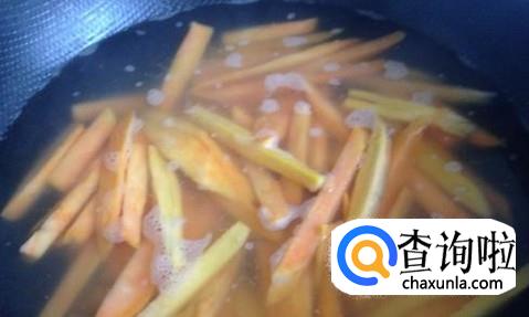 锅里面加油,烧热以后,我们就可以把地瓜条放进去炸,炸到金黄即可。
