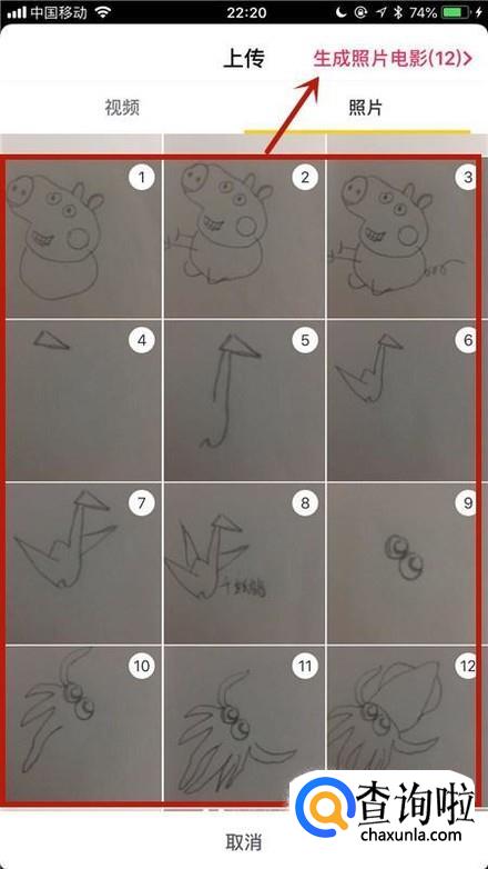 接着选择我们想要的照片并点击生成照片电影,如下图所示。