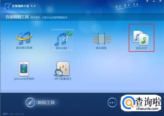 打开音频编辑器专家,然后点击合并音乐,如下图所示