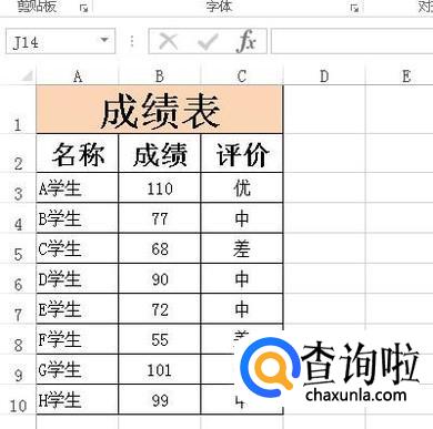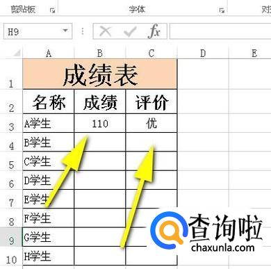 在B3输入110;按下回车键,在C3单元格自动显示评价:优