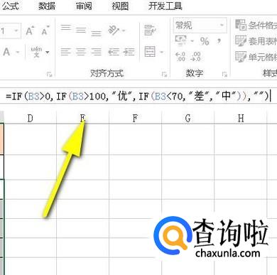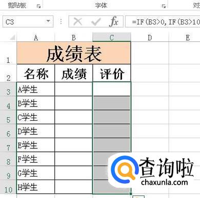 选中C2:C10这区域单元格,并在编辑栏中输入公式:=IF(B3>0,IF(B3>100,"优",IF(B3<70,"差","中")),"")