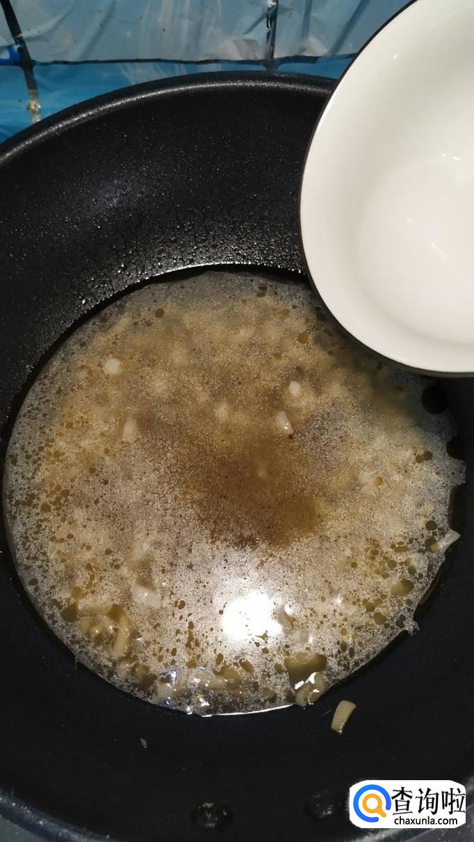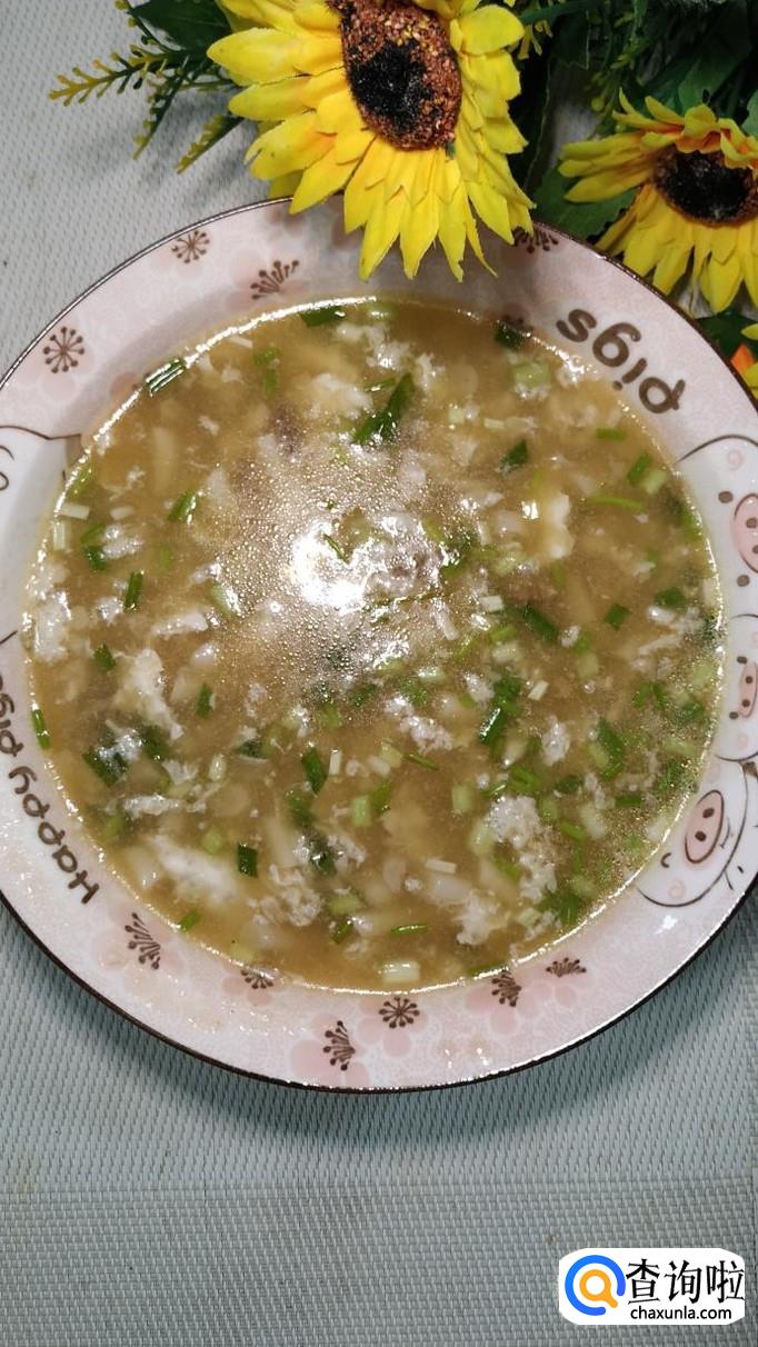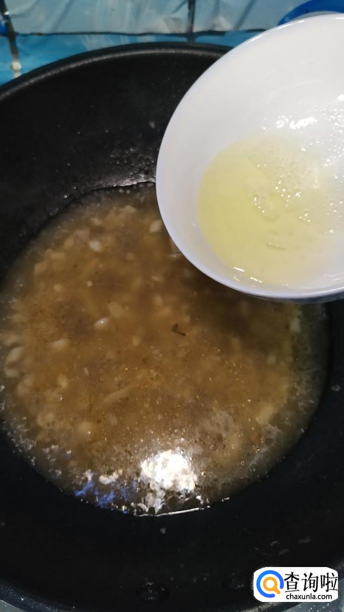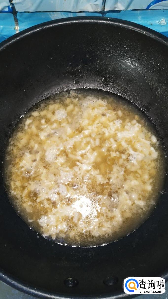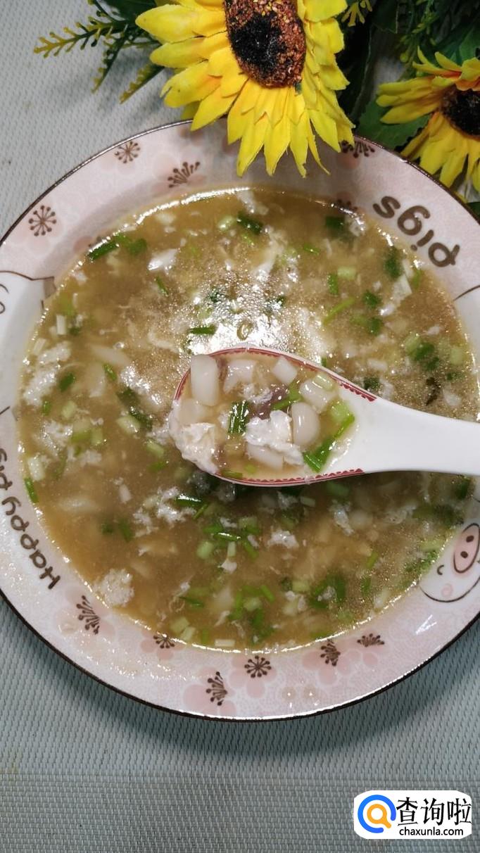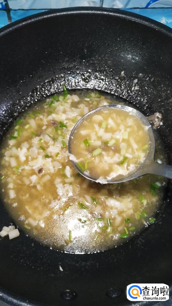 碗中放入少许淀粉,用清水拌一下,做成水淀粉,倒入锅中,熬至汤汁粘稠,然后将鸡蛋清倒入锅中,搅拌均匀。