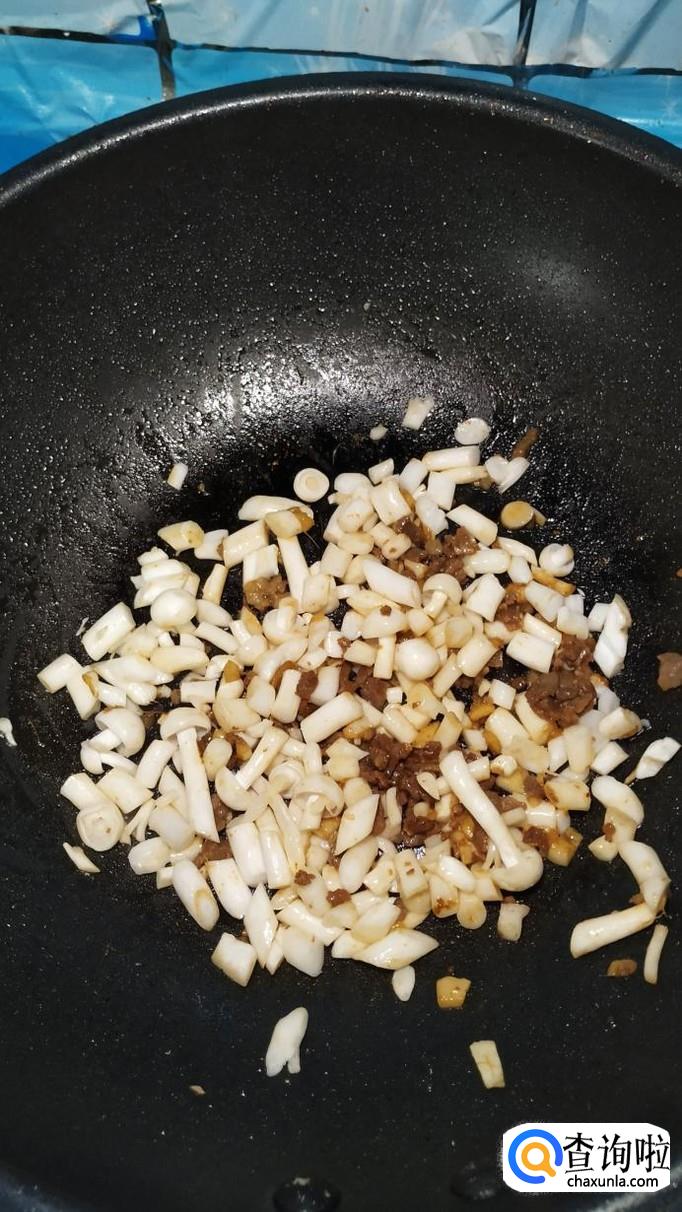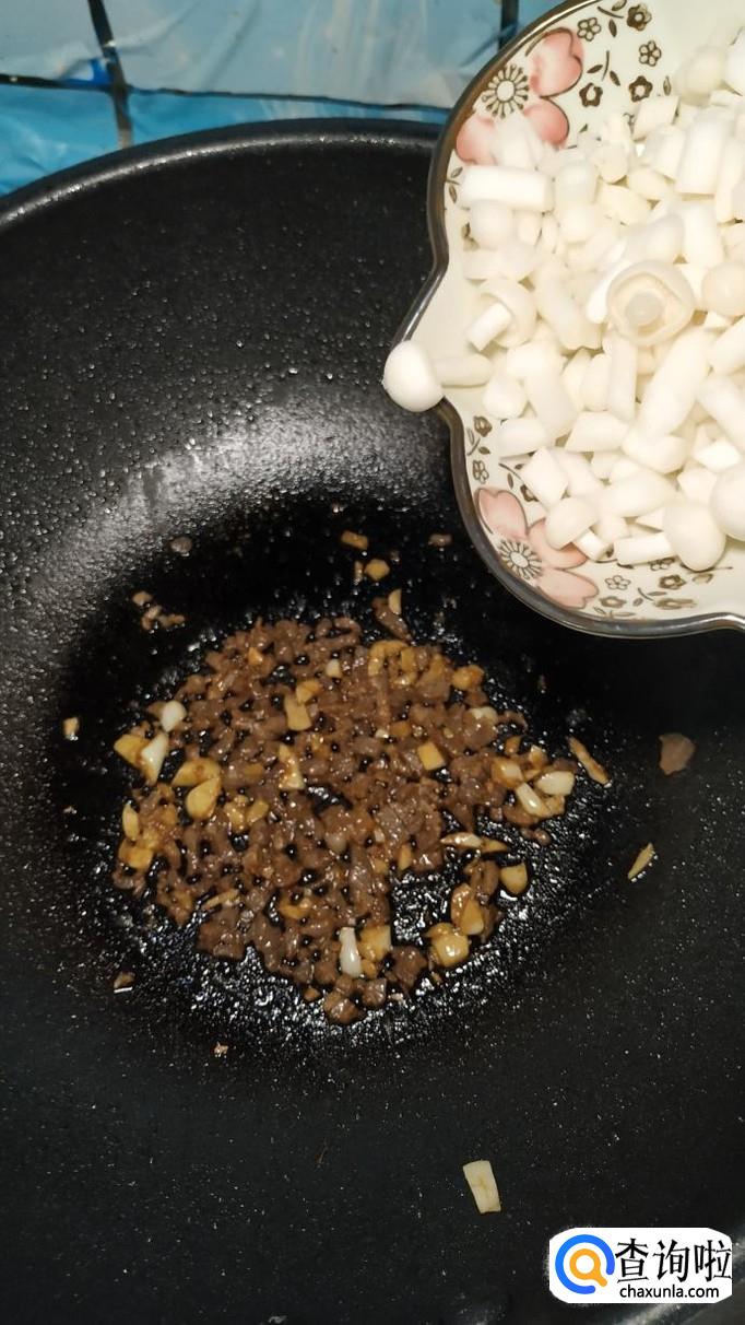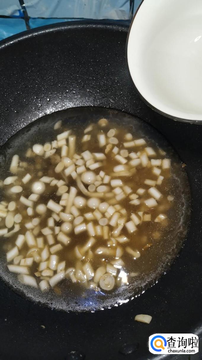 将海鲜菇倒入锅中,搅拌均匀,炒至海鲜菇微微变软就行了。