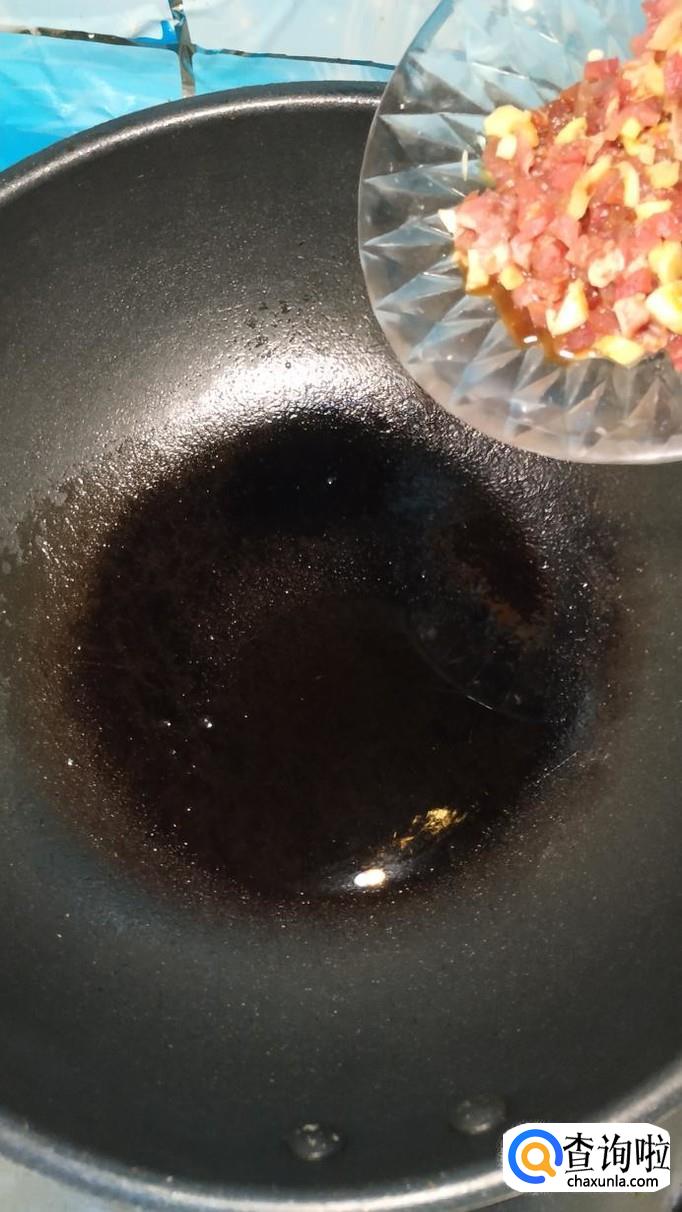 炒锅中放入适量油,腌好后,将腌好的牛肉粒放入锅中炒香,牛肉粒是比较容易熟的。