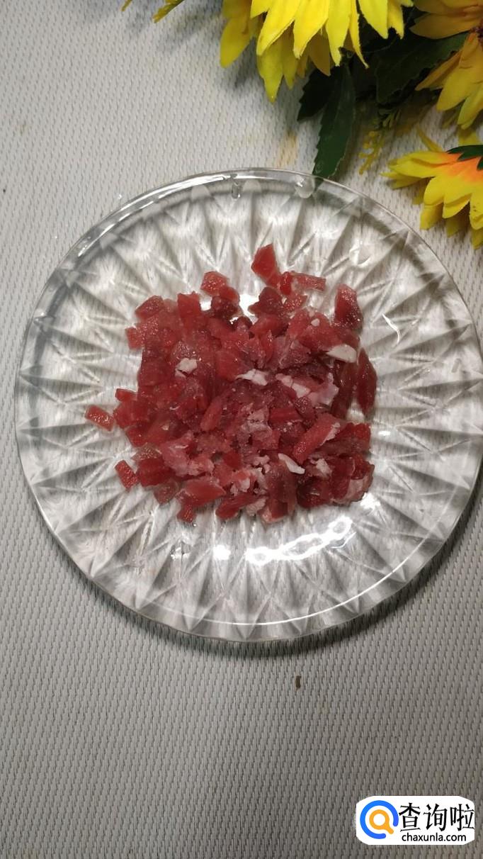 将牛肉洗净后切碎;将海鲜菇,切成小丁儿;再将鸡蛋打入碗中,然后将蛋清和蛋黄分离。