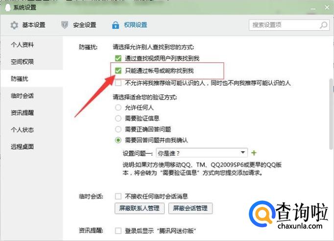 在“只能通过账号或昵称找到我”选项左边的方框中打上勾。完成之后,你的好友就能通过查找搜索QQ账号来找到你了。如图所示: