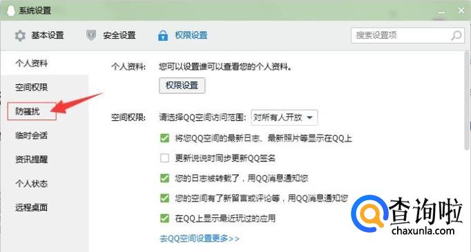 在权限设置界面中,点击左边的防骚扰。如图所示: