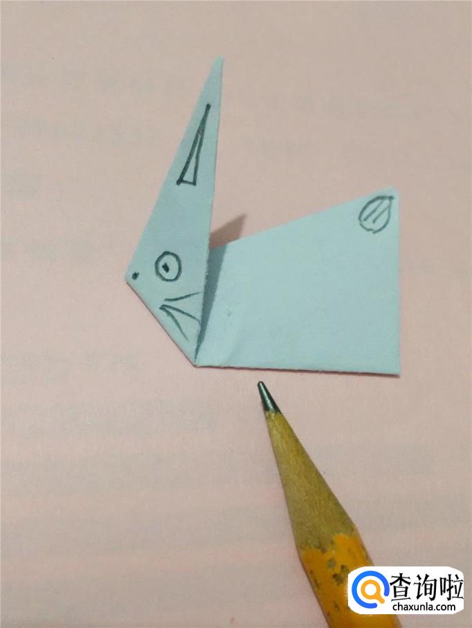 用笔在左边的小三角上画出耳朵、眼睛、嘴、胡子,在右上角画出小兔子的尾巴。小兔子就折完了。